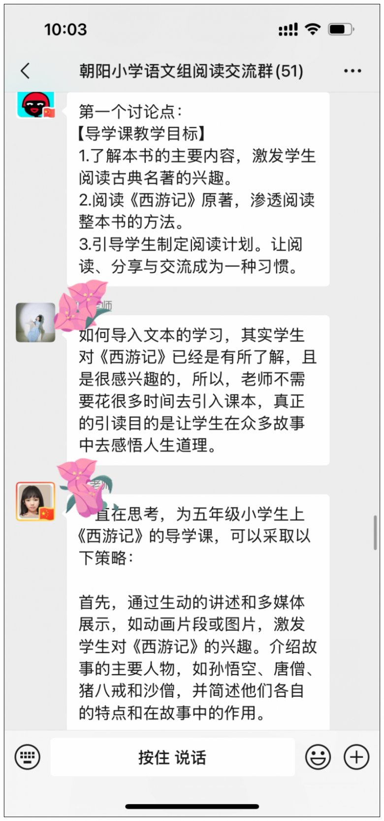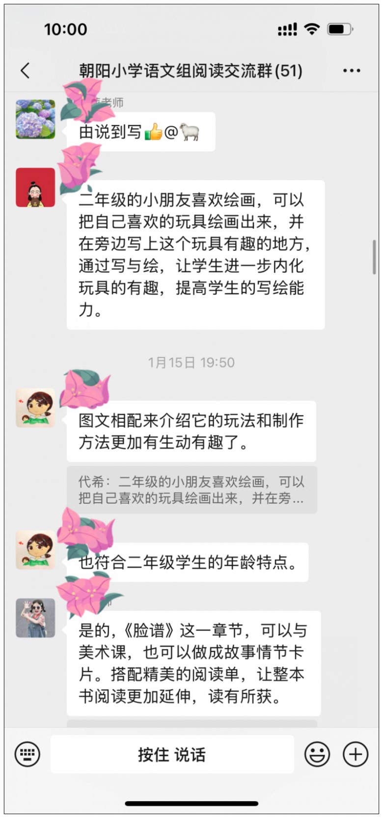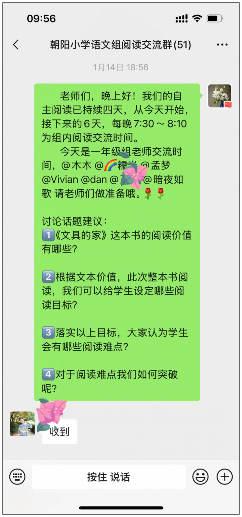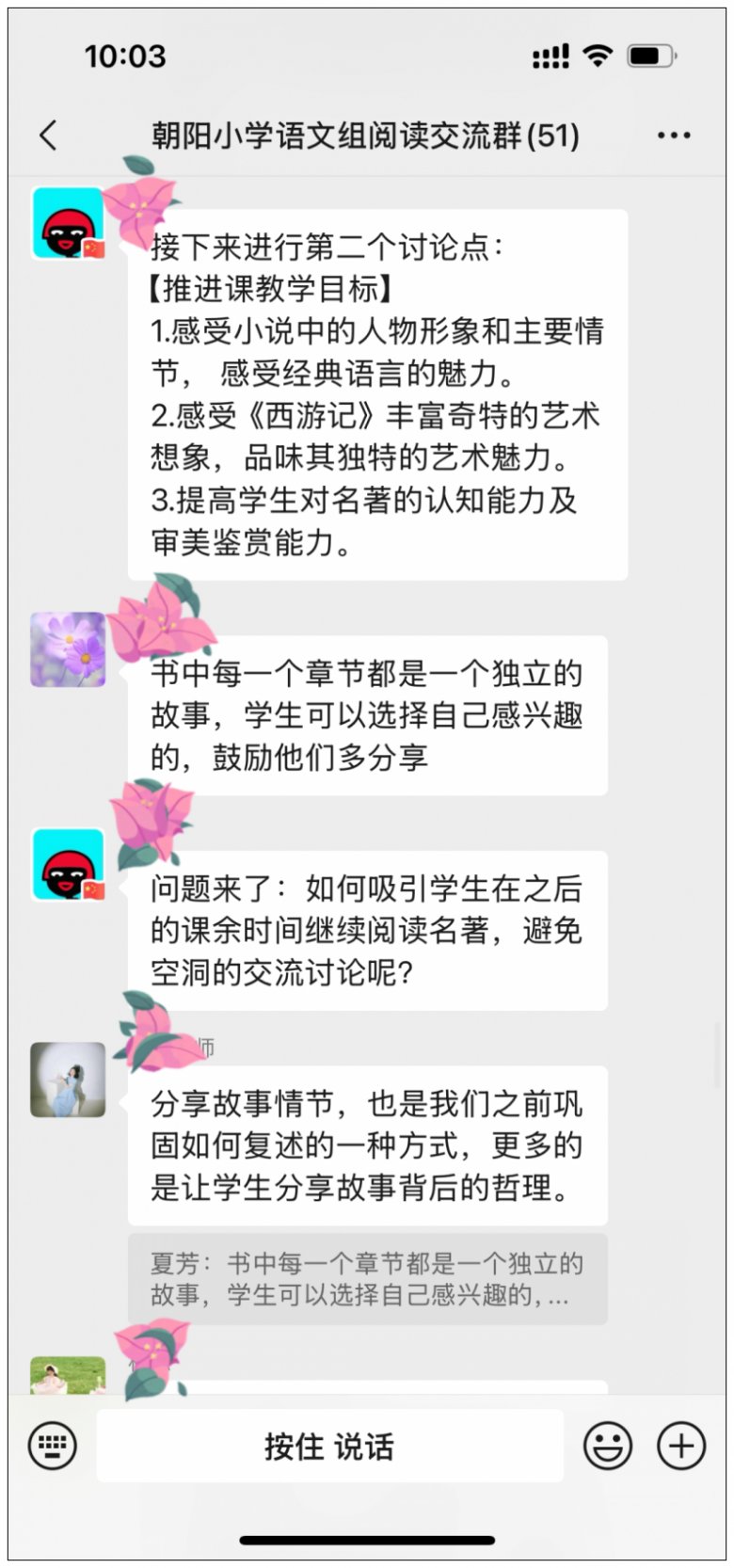 在个体研读的基础上,老师们分组开展了线上交流活动。大家围绕“学生阅读难点”“教师如何推动阅读”等话题畅所欲言,分享阅读心得,探讨阅读策略。思想的火花在云端绽放。