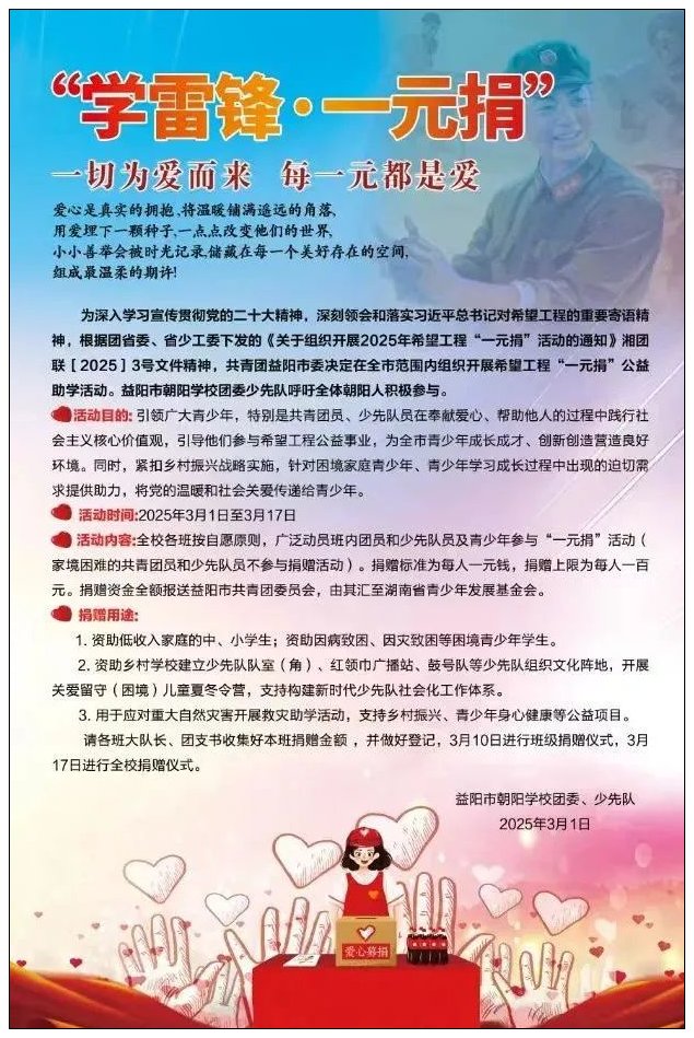 春暖三月天,爱撒雷锋月。3月17日益阳市朝阳学校在升旗仪式上举行了“学雷锋·一元捐”爱心捐赠仪式。在此之前,我校各班以主题班会的形式,向学生阐述了“一元捐”活动的目的和意义,并向学生发起捐款倡议。在各班班主任的有序组织下,同学们积踊跃捐款,纷纷献出了自己的零花钱、压岁钱,积极参与到捐款活动中,用实际行动诠释了新时代的雷锋精神。