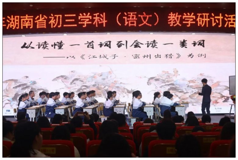 首节研讨课《从读懂一首词到会读一类词》由长沙市雨花区南雅双语实验中学胡淼老师执教。胡老师展现出深厚的专业素养和独特的教学智慧。课堂伊始,胡老师巧妙选取《江城子.密州出猎》这首独成一家的豪放词作,引导学生读、感、悟,九年级初107班的学生们积极踊跃发言,展现朝阳学子的风采:有的学生结合自身的生活体验,对词中的情感做出独特解读,赢得阵阵掌声;有的学生在老师的启发下,敏锐地捕捉到词的写作手法,并能举一反三,探讨同类词作的特点。在思维的激烈碰撞中,学生们逐渐掌握了读懂一类词的方法,搭建起解读词学的知识框架。