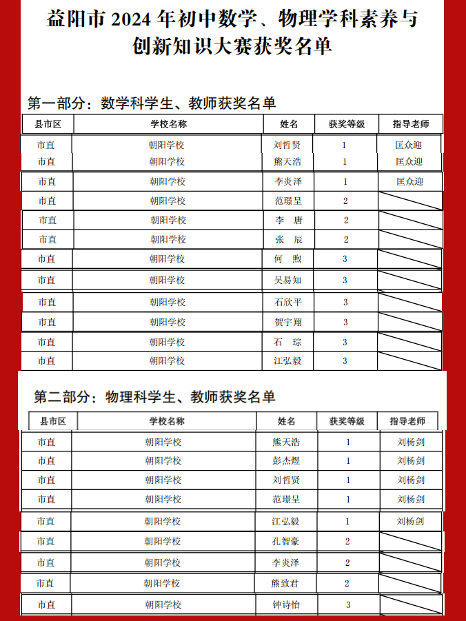 在2024年益阳市教育局组织的初中数学、物理学科素养大赛中,我校初中部取得佳绩:数学学科一等奖3人,二等奖3人,三等奖6人;物理学科一等奖5人,二等奖3人,三等奖1人。获奖人数和比例均居全市前列。