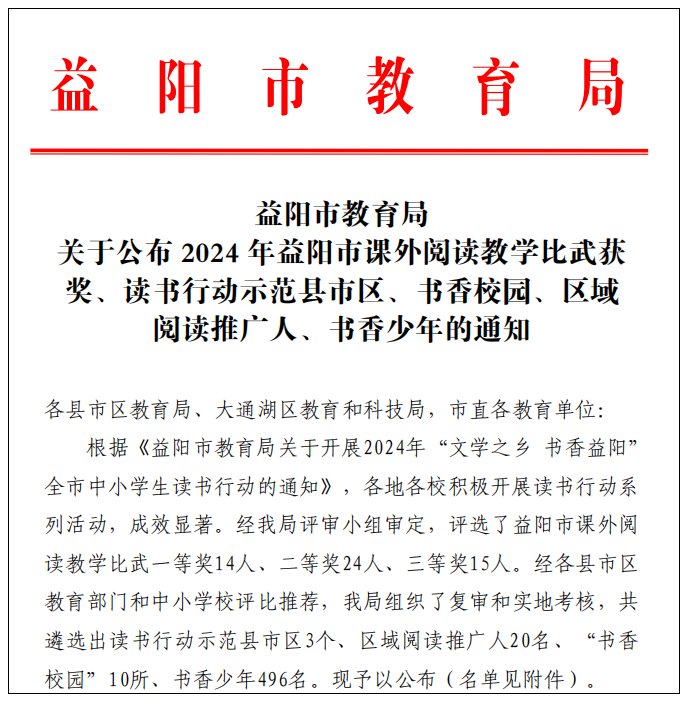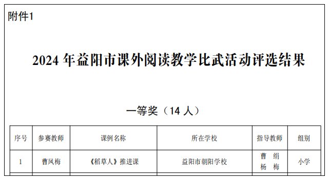 在益阳市教育局组织的2024年课外阅读教学比武、书香少年评比活动中,我校小学部曹凤梅老师执教的《稻草人》阅读推进课——获2024年益阳市课外阅读教学比武活动一等奖